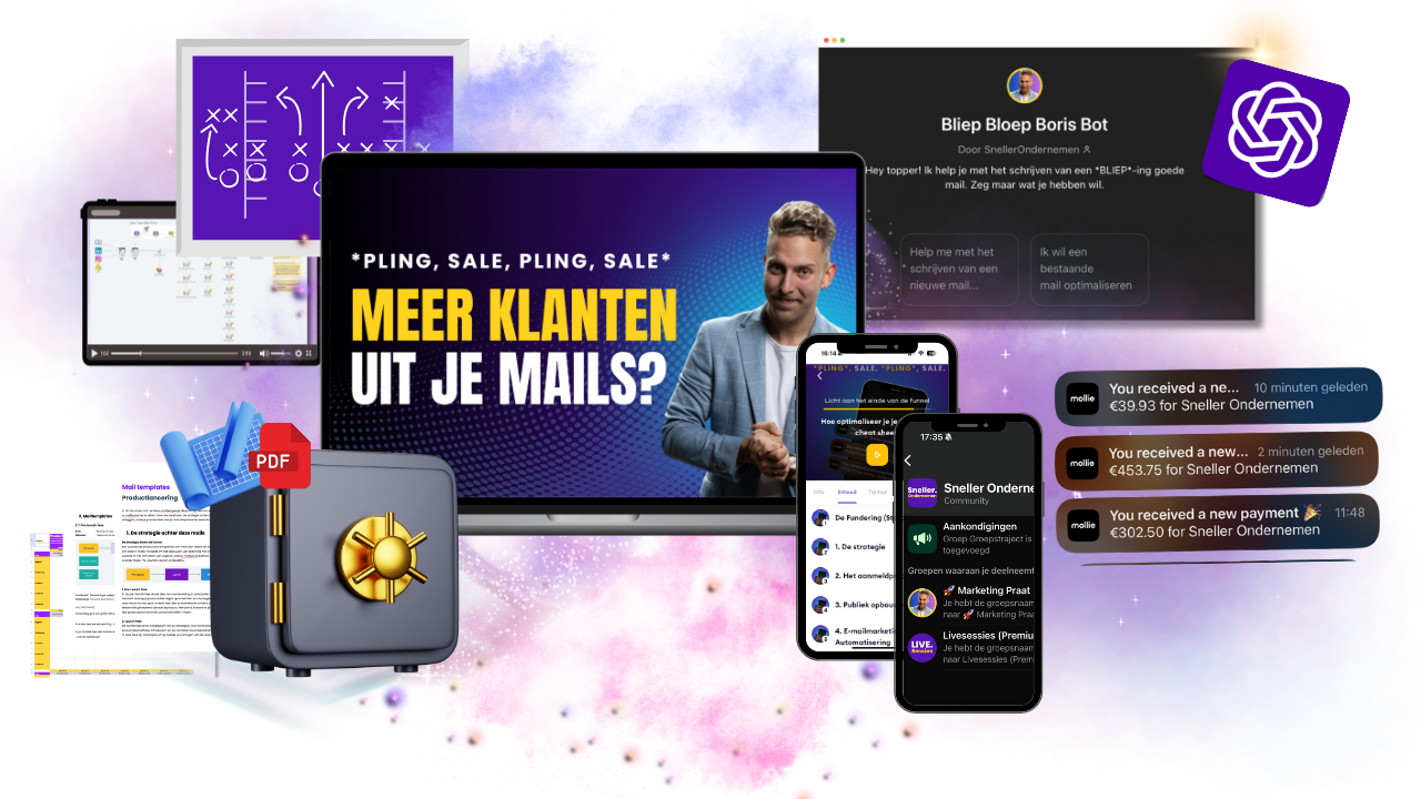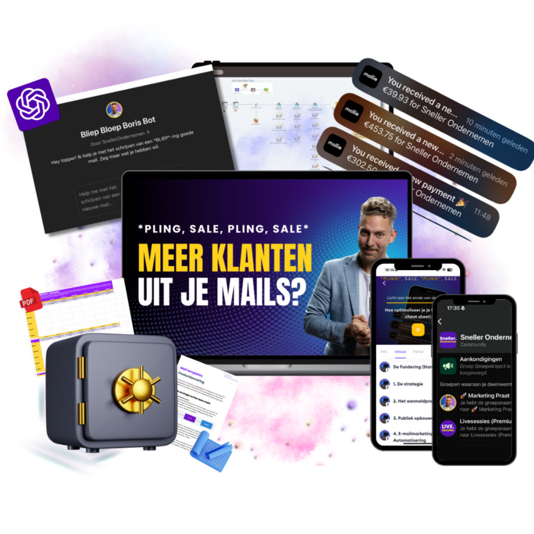 Een schat aan bewezen e-mailtemplates, funneltactieken en AI-tools, zodat jij meteen gas kan geven op je eigen business.