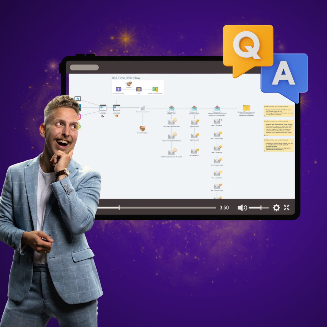 1x per week een Q&A en feedback sessie. Zo loop jij nooit meer vast en krijg je direct feedback op jouw funnel, e-mails en salespages.